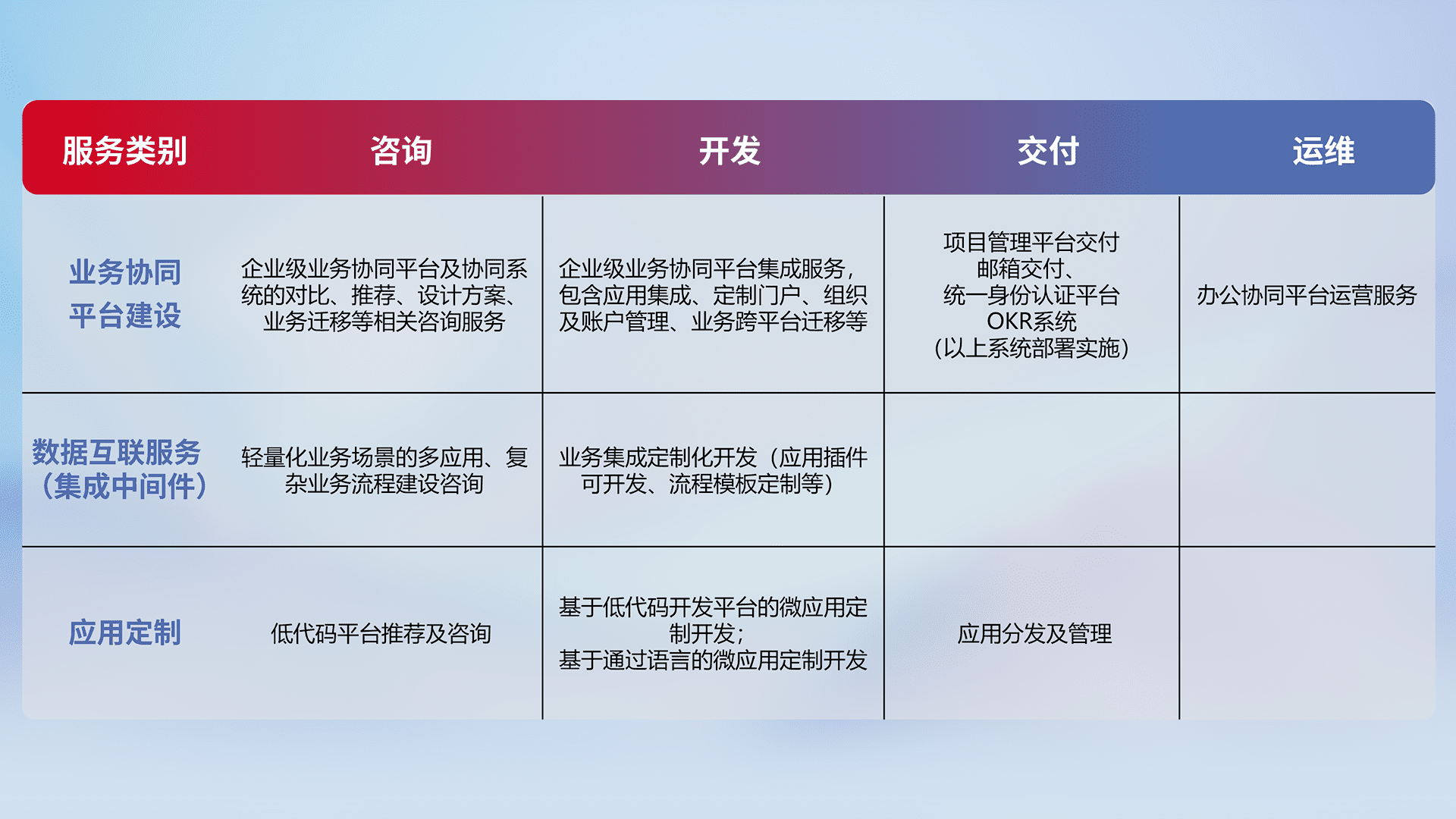针对钉钉、、、、企微、、IDaas等平台级产品提供产品的规划、、方案、、交付、、定制化开发等服务,,,实现如统一协同办公、、、、智能客户服务、、混合会议管理、、、智能数据查询、、等业务场景,,实现数字化转型。。。