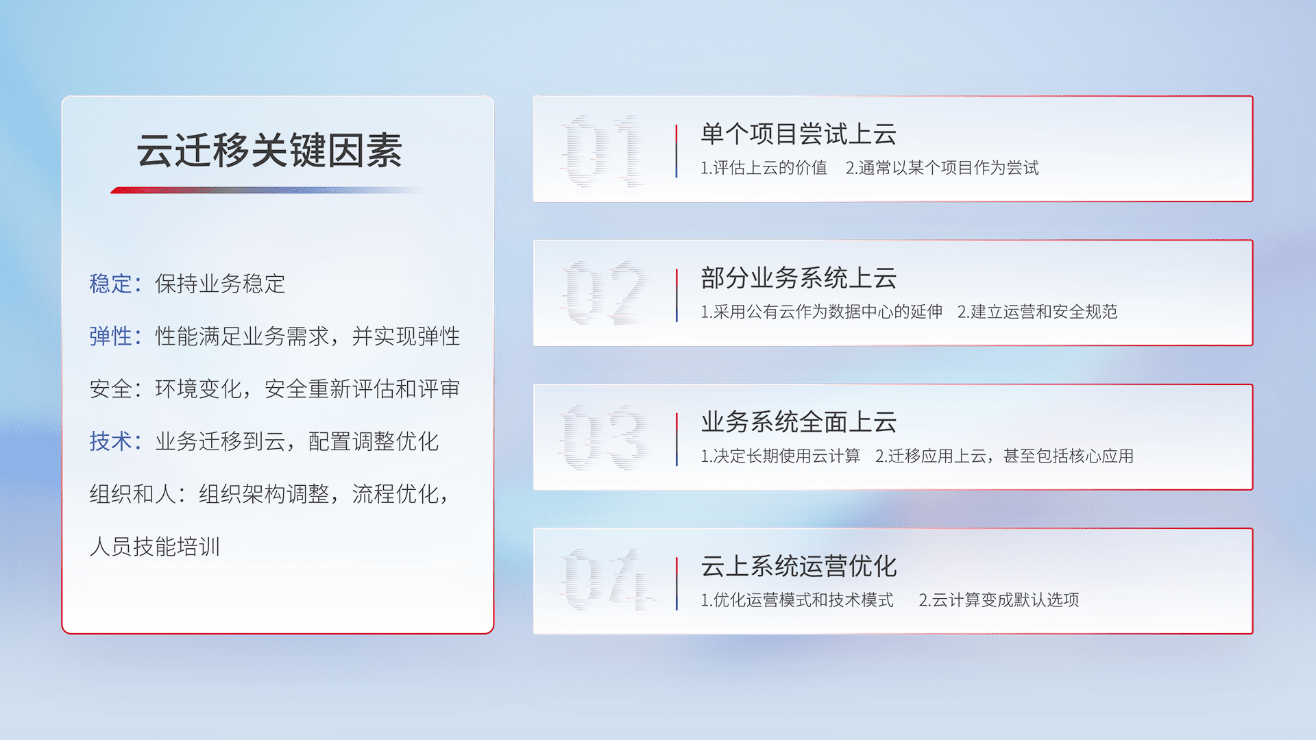 结合实际业务,,,,从规划设计、、、云平台选型、、云原生改造、、数据迁移、、、、集成交付,,,迁移全过程为客户识别最佳上云路径,,,做好风险识别管理,,,,设计网络架构、、、、身份权限、、、、安全审计合规、、、操作审计、、日志审计、、、、监控告警策略、、、、多站点容灾设计等,,,对云上基础设施进行整体规划,,,提升IT治理水平,,,以满足弹性、、、、高可用、、高性能的需求。。。