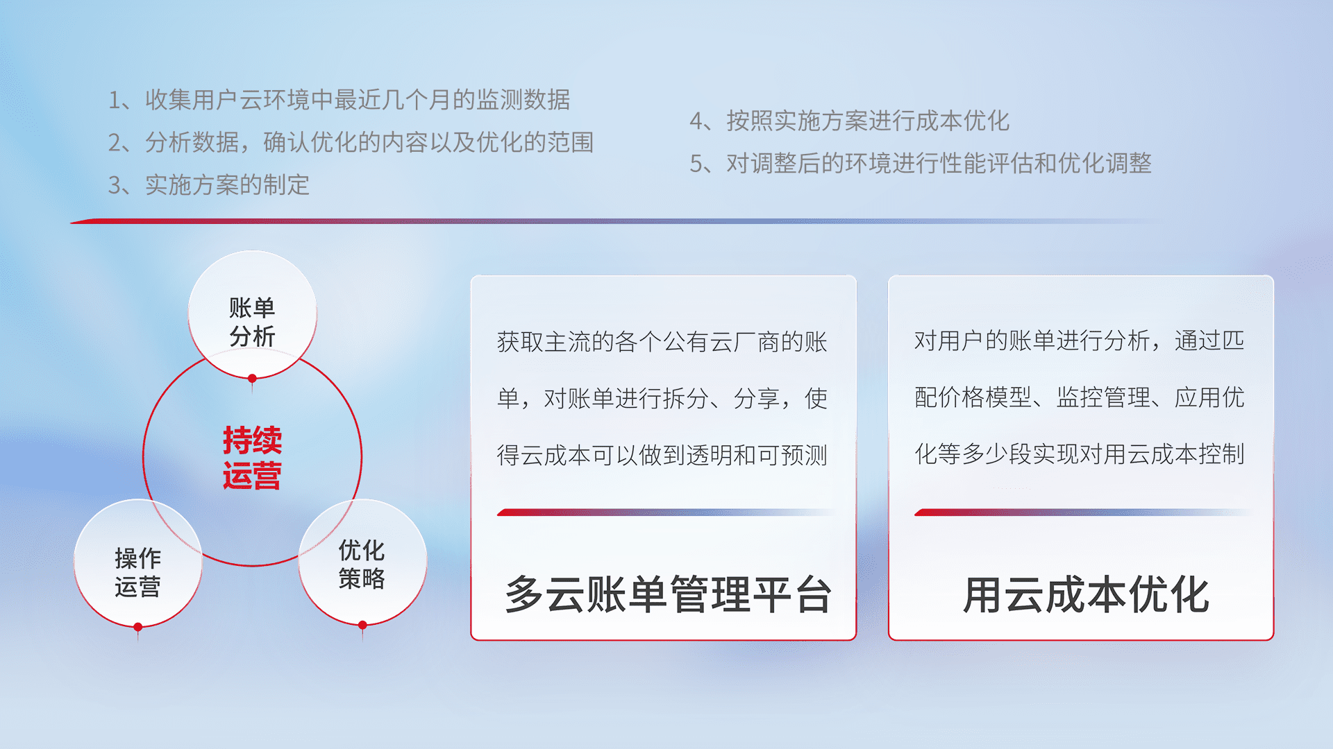 通过多云纳管,,,以统一的资源数据模型把客户的云资源进行抽象和封装,,,进而实现对多云资源的统一操作,,,,保障云资源管理的可靠性、、、稳定性与可用性。。量身定制化运维内容,,,,配置、、开发运维、、、补丁管理、、备份、、、监控、、、、认证和访问管理、、审计和日常巡检等,,,保障在用云过程中的可靠度,,,,稳定度以及高可用率。。。